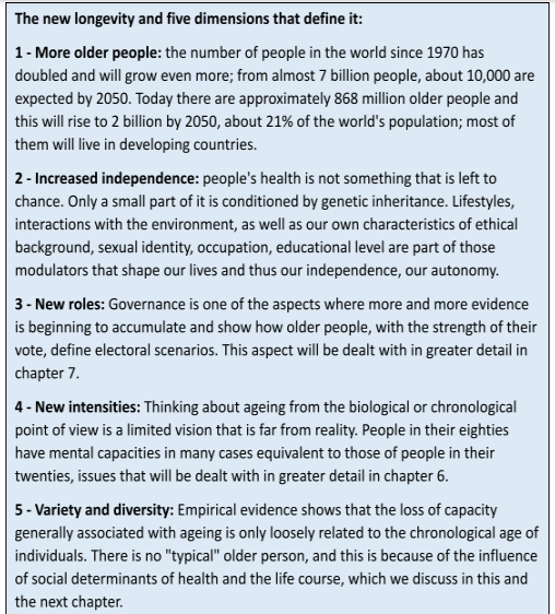 The new longevity frames and integrates the quantitative aspect with the qualitative aspect that makes it possible for people to live this time with a different intensity, motivations, projects, quality of life and well-being. We can identify several dimensions that define it3.