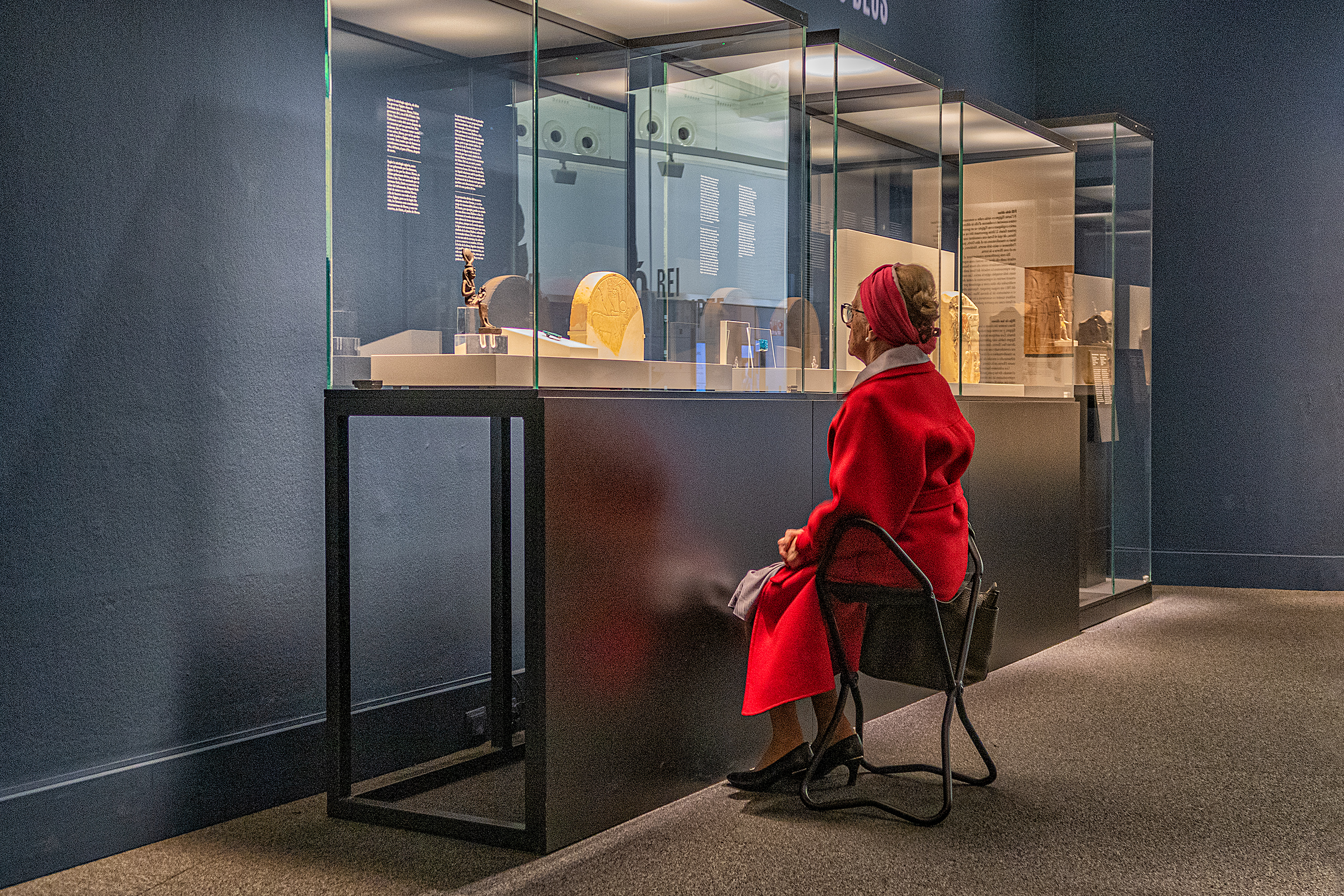 Persona mirando exposicion de arte egipcio.