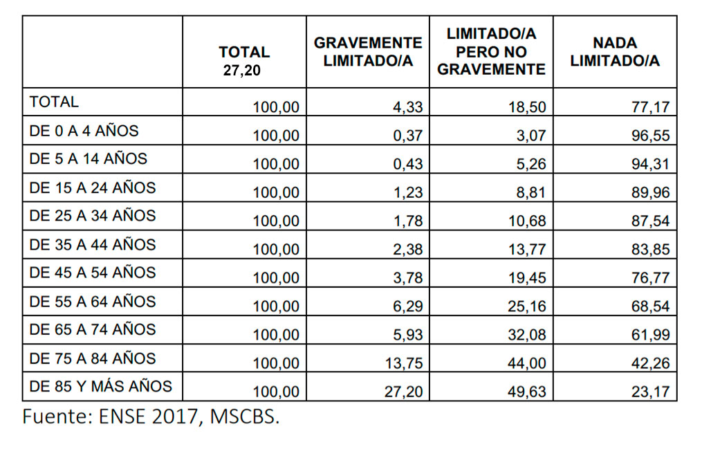 Suele asociarse el avance de la edad con la dependencia funcional porque gran parte de las personas afectadas por una discapacidad se encuentran en el grupo de los que han cumplido los 65 años; también es este el grupo de edad que presenta más limitaciones en las actividades de la vida diaria. como vemos en la siguiente tabla: