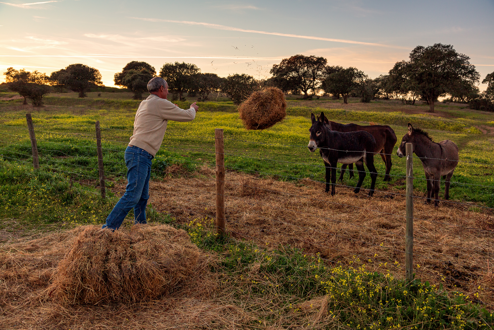 Homem a alimentar os burros