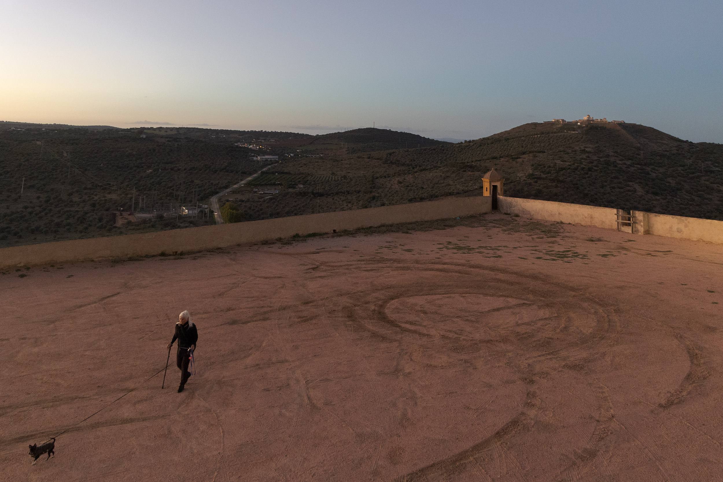 una anciana pasea a su perro al final del día, en Elvas, Portugal