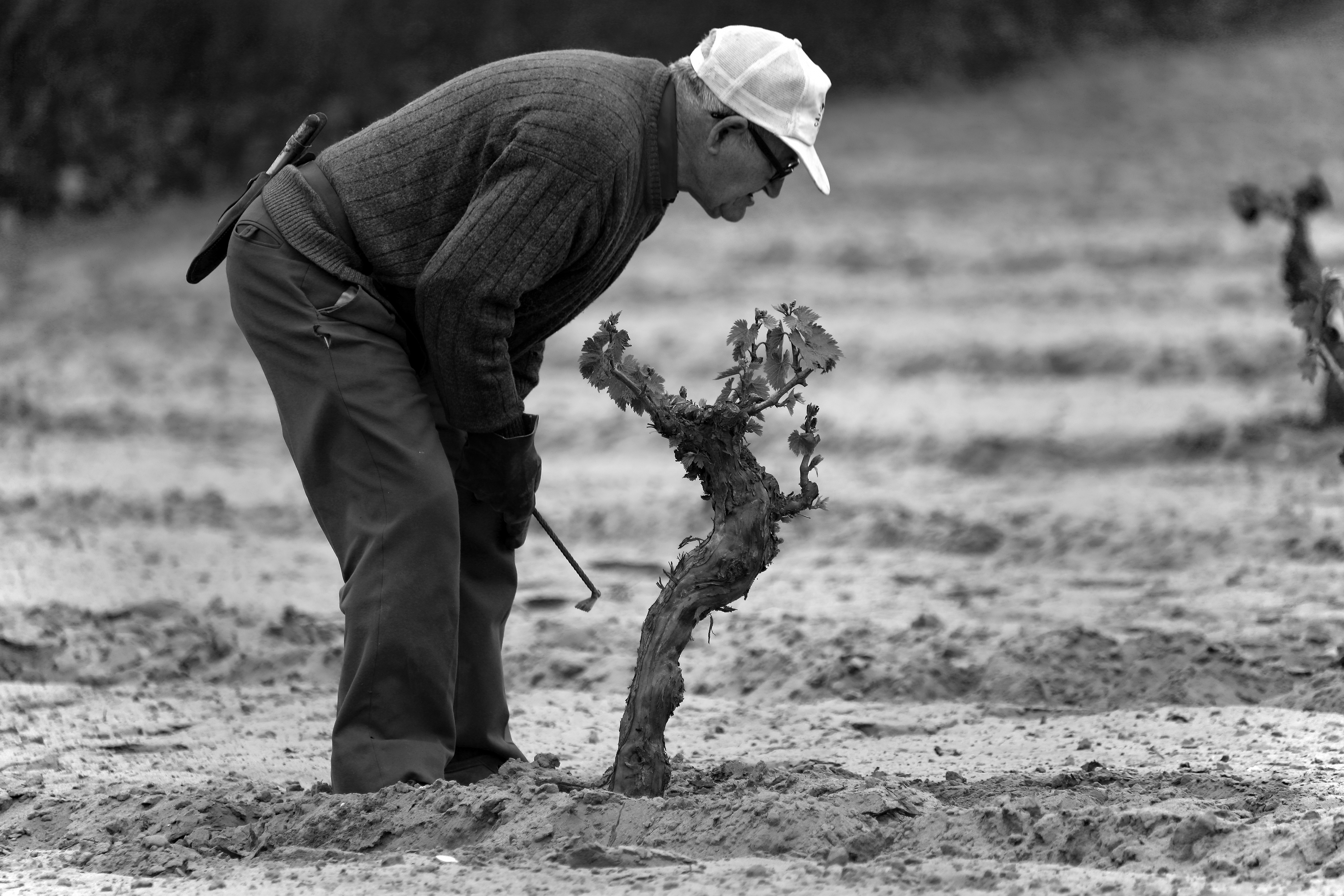 El abuelo contempla pensativo la cepa una vez que la ha dejado impoluta como toda la viña. Estamos en Don Benito (Badajoz) en la primavera de 2022.