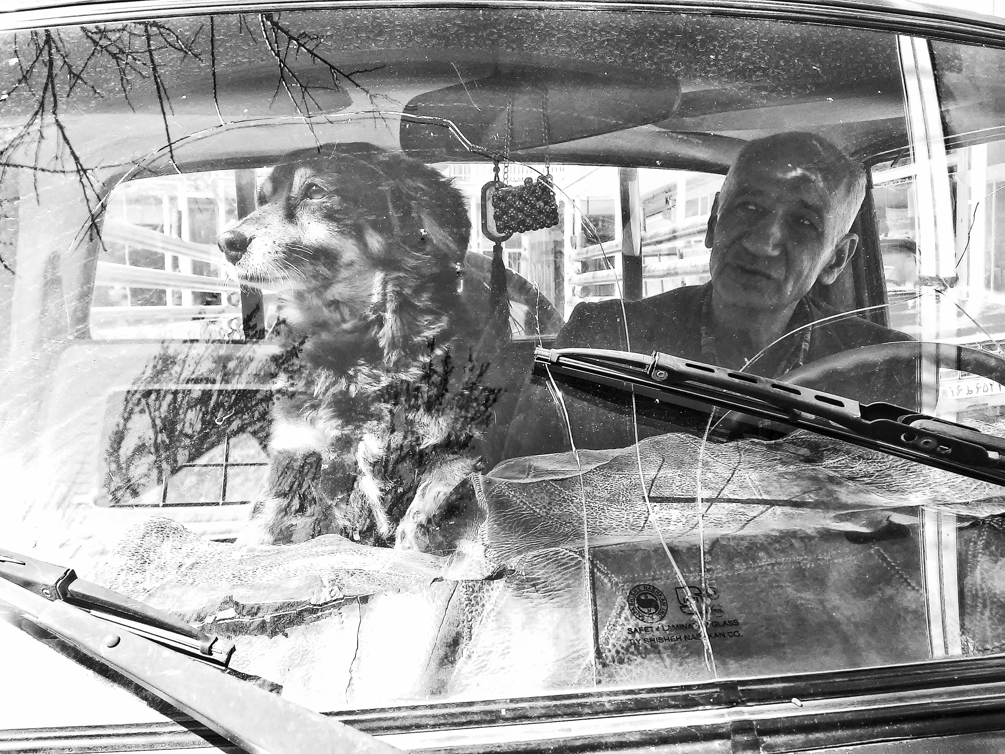 The old man and his dog in the car