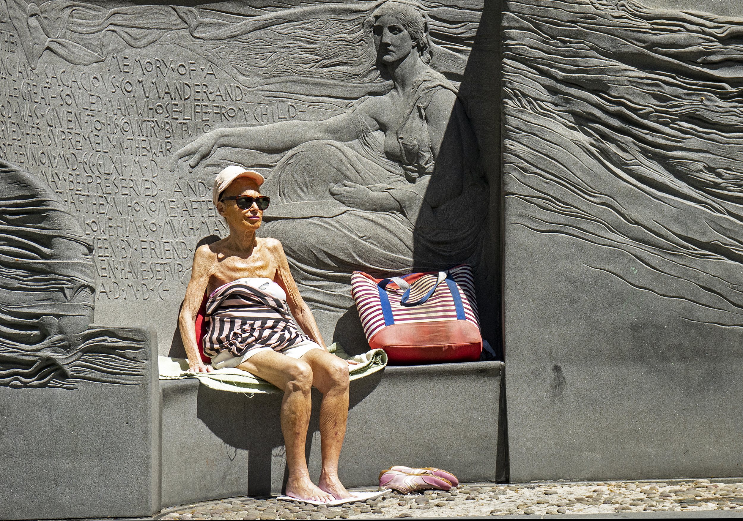 Uma senhora apanha descontraidamente sol em Madison Square Park (New York).