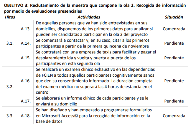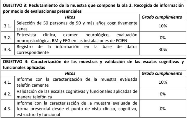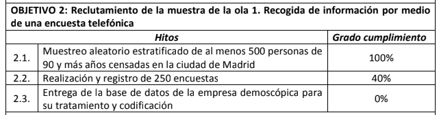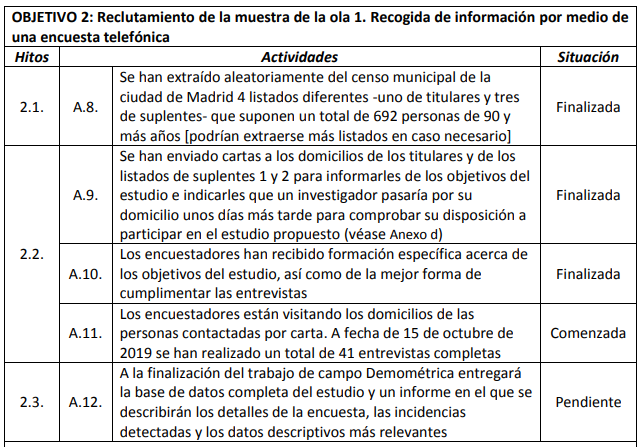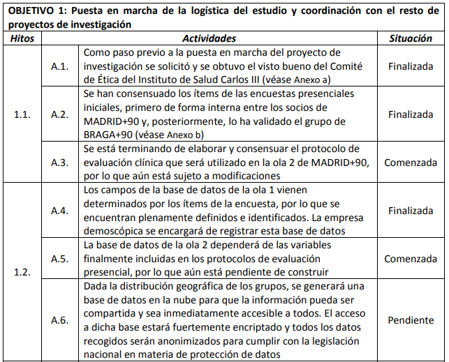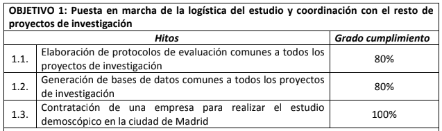The following table lists the objectives of MADRID+90, briefly summarizes the milestones associated with each of them and quantifies the current degree of compliance.