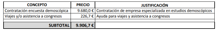 Due to delays beyond our control, which have already been commented on in previous sections and which have caused a delay in the start of the study, only a small part of the MADRID+90 budget has been executed at the present time. Specifically, the concepts that have been implemented are as follows:
