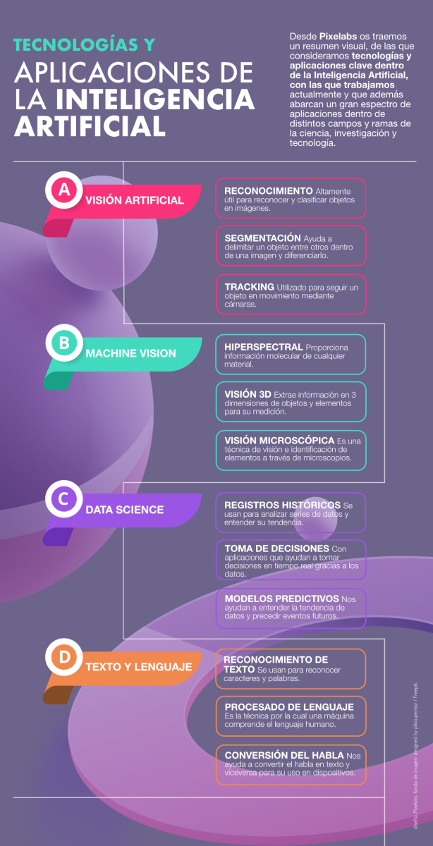 We are adding a new series of infographics to the blog where we will illustrate the latest technologies in the field of Artificial Intelligence (AI) and explain their applications in different fields and areas of action. Currently there are so many applications that it is not an easy task to describe each one of them, therefore, in this series and through different approaches we will see the latest developments in a simple and visual way available to everyone.