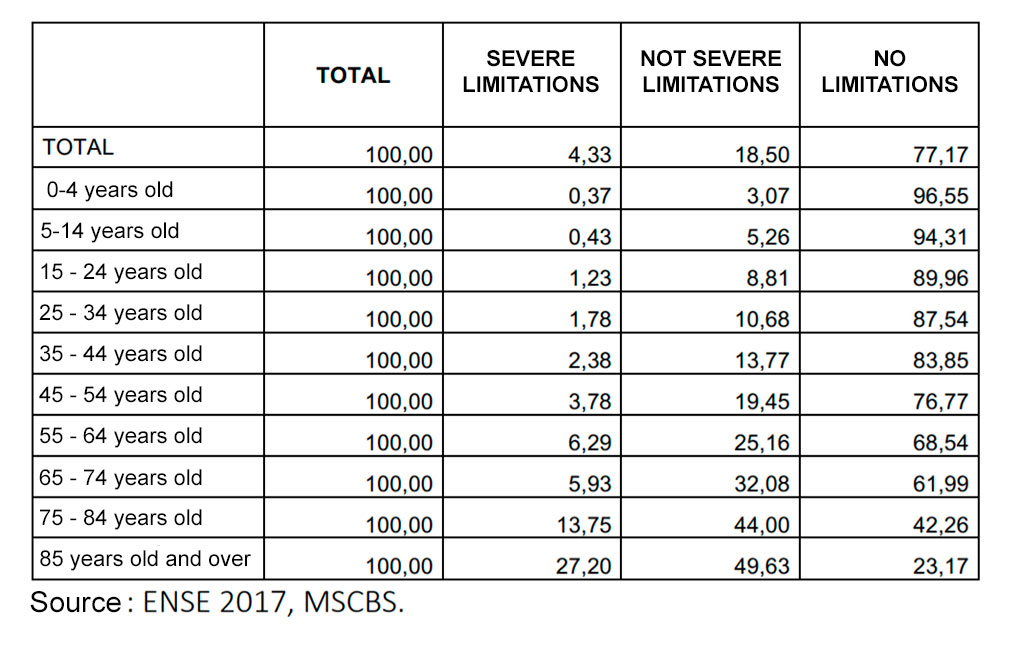 First of all we need to distinguish the age group, as a situation of a 66 year old and this of a 92 year old will not be the same. Data provided by the National Health Survey (ENS) states that 61,99% of people aged from 65 to 74 years do not suffer from any limitations (this number is higher in the case of men, 67,82%) and 32,08% suffer from not serious limitations. It is clear that these numbers decrease as the age increases and the presence of severely restricted people reaches its highest point in the group of those aged 85 years or more (27,2%). However, this data helps us understand that not every person aged 65 and over suffer from limitations in their everyday activities.