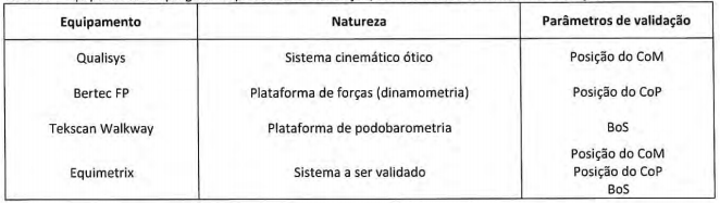 La validación del sistema Equimetrix presupone la recopilación simultánea de datos con sistemas estándar (gold standart) a fin de evaluar la exactitud y precisión de los datos obtenidos por este sistema. En la etapa de diseño se determinó que los sistemas ópticos e inerciales debían utilizarse para la validación de la estimación de la posición del centro de masas (CoM), así como las soluciones baropodométricas y dinamométricas para la comparación de la posición del centro de presión (CoP) y la base de apoyo (BoS).