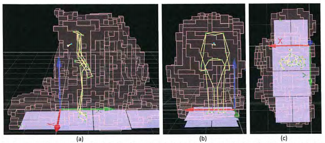 Figura 1 - Ilustración del volumen calibrado (color rosa semitransparente) y la posición relativa del voluntario en el interior visto en el (a) plano sagital, (b) frontal y (c) transversal.