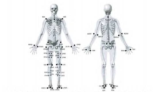 Para modelar el cuerpo del voluntario, se colocaron marcadores retrorreflectantes en varios puntos anatómicos para permitir la posterior reconstrucción en 3D en el software de análisis biomecánico Visual3D (C-Motion, EE.UU.), y el cálculo de su CoM. El modelo de cuerpo entero utilizado puede verse en la figura 2. En la sección 7 de este informe se puede encontrar una imagen más detallada, así como una tabla explicativa de la nomenclatura utilizada para identificar los puntos anatómicos seleccionados. Obsérvese que aunque no se han colocado marcadores en el segmento de la cabeza, también se modeló como perteneciente al segmento del tronco.