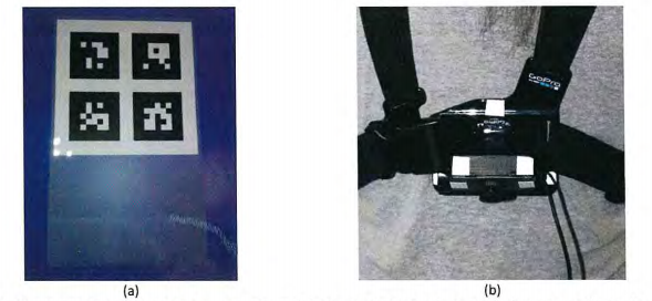 Figura 3 - Representación de la colocación de la cinta retrorreflectante en (a) el patrón óptico y (b) la cámara y el arnés del sistema Equimetrix.