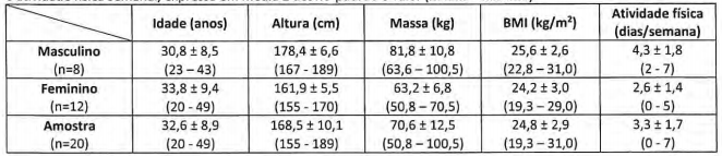Tabla II - Caracterización de la muestra reclutada en términos de sexo, edad, altura, masa, indica la masa corporal (IMC) y la actividad física semanal, expresada en media ± desviación estándar y valor (minino - máximo).