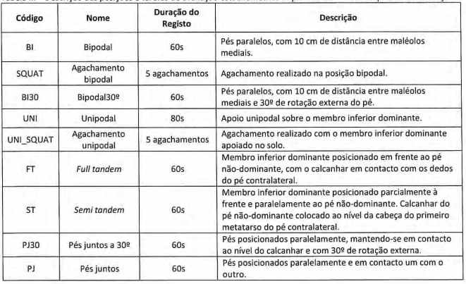 Durante el período de recolección se le instruyó al voluntario a permanecer en una posición inmóvil, sin posibilidad de mover las piernas, brazos o cabeza, y a fijar un punto a 5 metros de distancia y a la altura de sus ojos. En el caso de las tareas en cuclillas, se instruyó al voluntario para que tratara de mantener el tronco vertical, pudiendo utilizar las extremidades superiores para mantener el equilibrio, y para realizar las cinco cuclillas a una velocidad seleccionada por él mismo. Toda la postura en cuclillas empezó y terminó en una posición bipodal.