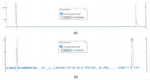 Figura 5 - Identificación del comienzo (línea vertical roja) y el final (línea vertical verde) del período de recolección realizado por a) el sistema cinemático y dinamométrico y b) el sistema Equimetrix.
