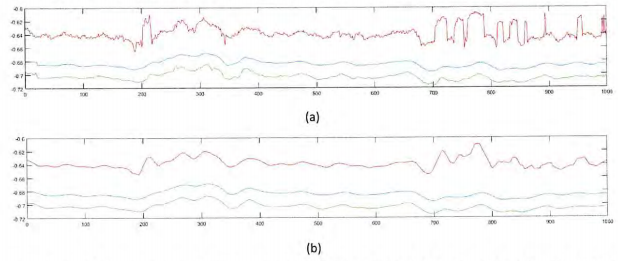 Figura 6 - Ilustración del componente anteroposterior de los datos de V3D_CoM (azul), V3D_CoP (verde) y EQM_CoM (rojo), ilustrando su aspecto a) inicial y b) después de la aplicación del alisado de media móvil de 20 puntos.