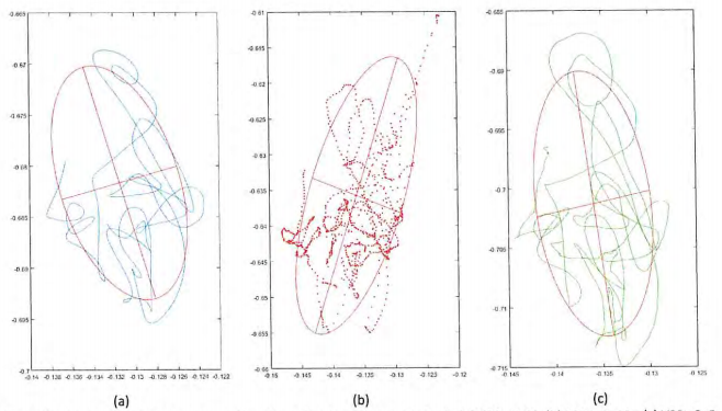 Figura 7 - Estatoquinesiograma y su elipse de migración en (a) el espacio V3D_CoM, (b) EQM_CoM y (c) V3D_CoP.