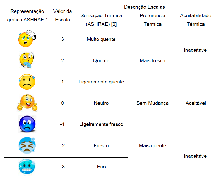 Relativamente aos questionários sobre sensação térmica, aos utentes e residentes dos edificados em estudo, várias questões foram propostas, atribuindo um sistema de pontuação. Para a atribuição de valores e utilização de escalas, foram selecionadas escalas conhecidas como apresentado na Tabela 1.