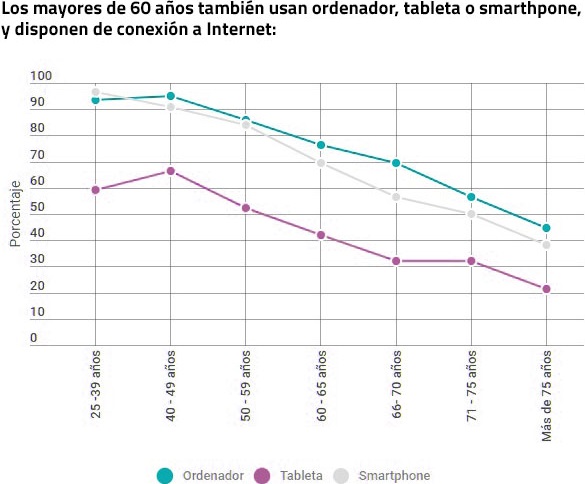 Independientemente de cual sea el equipo con el que cuenta, lo utilizan de forma habitual (varios días a la semana o todos los días) los de menos de 60 años (90%) y sólo un 56% los que tienen más de 60 años, lo que representa un disminución de más de 34 puntos porcentuales al pasar de un tramo de edad a otro; esta disminución aumenta sobre todo a partir de los 66 años. El 57% de las personas de más de 75 años nunca utiliza un dispositivo electrónico, mientras que los de 25 a 29 años los utilizan prácticamente todos. La razón hay que buscarla en parte en la falta de disponibilidad del equipo, ya que de media el 26,3% de los mayores de 60 años no disponen ni de ordenador, ni de teléfono inteligente, ni de tableta; porcentaje que alcanza un 29,25% en edades de 71 a 75 años y del 42% para 75 años  o más. En cambio, los que disponen de los tres equipos  son el 55,6% y el 23% de las personas menores y mayores de 60 años respectivamente.