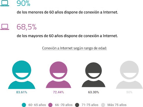 La práctica totalidad de los que disponen de alguno de estos dispositivos, disponen también de conexión a internet. El acceso a internet es generalizado en menores de 60 años (90%) y alcanza el 68,53% para mayores de 60 años, alcanzando sólo el 50% en mayores de 75 años. Es a partir de los 66 años cuando se nota una reducción notable de esta disponibilidad. El acceso a internet es frecuente (varios o todos los días de la semana) para los menores de 60 años, tanto a través de ordenador como a través de tableta o teléfono inteligente (82% y 81% respectivamente). A medida que aumenta la edad esa frecuencia disminuye, sobre todo a partir de los 66 años, pasando a ser de un 64% a través de ordenador y de un 44% a través de dispositivos móviles.
