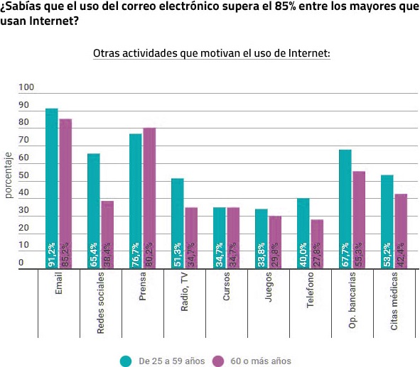 Las dos actividades que más motivan el acceso a internet, sea cual sea la edad, es consultar el correo electrónico y leer prensa y noticias. Salvo en esta faceta de utilizar internet para leer prensa y noticias, en el resto de actividades su utilización está significativamente más presente en los menores de 60 años que en los mayores de 60. La utilización de internet para actividades de tipo funcional (relación con bancos, citas médicas) presenta valores altos también para los mayores de 60 años (55% y 42% respectivamente, de aquellos que utilizan internet), lo que implica una importante apertura para cambiar o complementar el canal físico con el electrónico. Si los bancos han conseguido que el 55% de los clientes de más de 60 años que utilizan internet hagan operaciones a través de este canal, las organizaciones médicas públicas y privadas, por analogía, tienen un margen por delante para aumentar aún más su relación a través del canal electrónico partiendo del 42% actual. En donde se aprecian las mayores diferencias entre los valores alcanzados por los menores de 60 años en relación a los mayores de esa edad, es en participar en redes sociales y seguir cursos de formación.