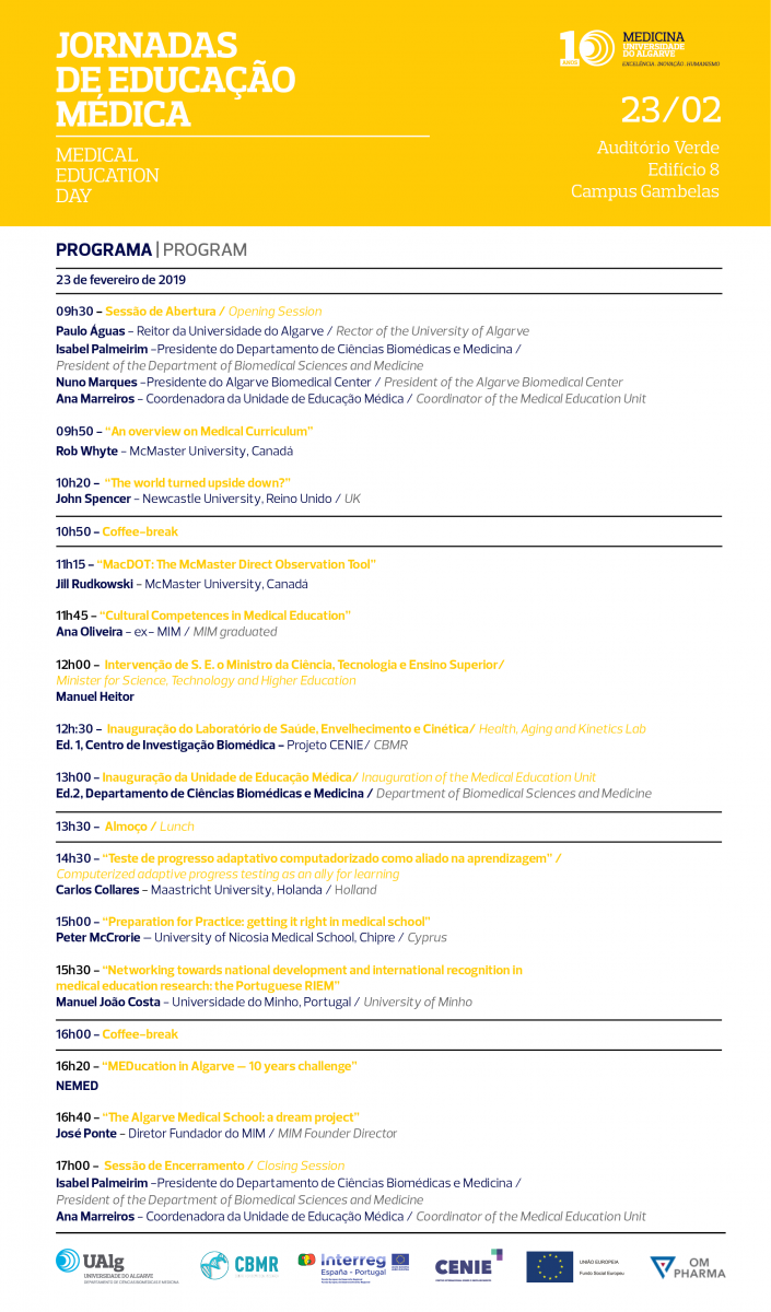 As Jornadas de Educação Médica são organizadas pelo Departamento de Ciências Biomédicas e Medicina e contarão com a presença de vários oradores de universidades de países como o Canadá, Reino Unido, Chipre, Holanda, entre outros, que irão abordar questões da escola médica actual a nível internacional, proporcionando um debate científico e promovendo a troca de ideias.