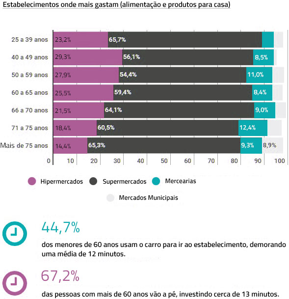 Pessoas com mais de 60 anos estão mais envolvidas nas compras de produtos do que pessoas menores a essa idade, especialmente as de mais de 75 anos, que o fazem muito mais do que pessoas entre 25 e 39 anos. No entanto, todas as faixas etárias geralmente fazem as suas compras num número muito similar de estabelecimentos, a média é de quase 3 estabelecimentos. As diferenças estão na maneira de chegar ao estabelecimento e no tempo que demoram. Enquanto 44,7% dos menores de 60 usam o carro para ir ao estabelecimento, tendo em média quase 12 minutos, 67,2% das pessoas com mais de 60 vão a pé, investindo cerca de 13 minutos. Essas diferenças são acentuadas à medida que as diferenças de idade aumentam, ao ponto de que 49% das pessoas entre 25 e 39 anos usam um veículo para levar algo menos de 11 minutos, enquanto 3 de 4 pessoas mais velhas de 75 preferem ir a pé, embora isso signifique investir 23 minutos, mais do dobro do que faixa etária acima mencionada.