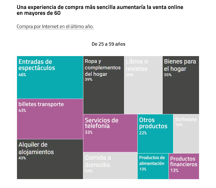 Qualquer tipo de produto ou serviço é adquirido em menor proporção à medida que aumenta a idade das pessoas que compram online. Esta diminuição segue uma tendência progressiva até chegar a um determinado nível de idade entre os 60 e 70 anos (dependendo do produto ou serviço), após o que a diminuição é mais acentuada. Por exemplo, enquanto cerca de 5 em cada 10 compradores com idades compreendidas entre 25 e 49 compra bilhetes de transporte, alugam alojamentos ou compram entradas para espectáculos, essa proporção é reduzida para 1 em cada 10 para compradores com mais de 70 anos de idade. Outros exemplos são produtos como vestuário e acessórios, bens para casa, revistas e livros ou serviços telefónicos que são adquiridos pela internet em aproximadamente 4 em cada 10 compradores entre 25 e 49 anos, enquanto apenas fazem isso cerca de 7% dos compradores com mais de 65 anos. Em contraste, em outros produtos como alimentos, software financeiro ou informático, a queda é mais suave e apenas os mais jovens compram entre o dobre e o triplo que os mais velhos. Em contraste, destaca-se que os compradores entre 25 e 39 anos pediram comida a domicílio quase 40 vezes mais do que aqueles com mais de 75 anos.