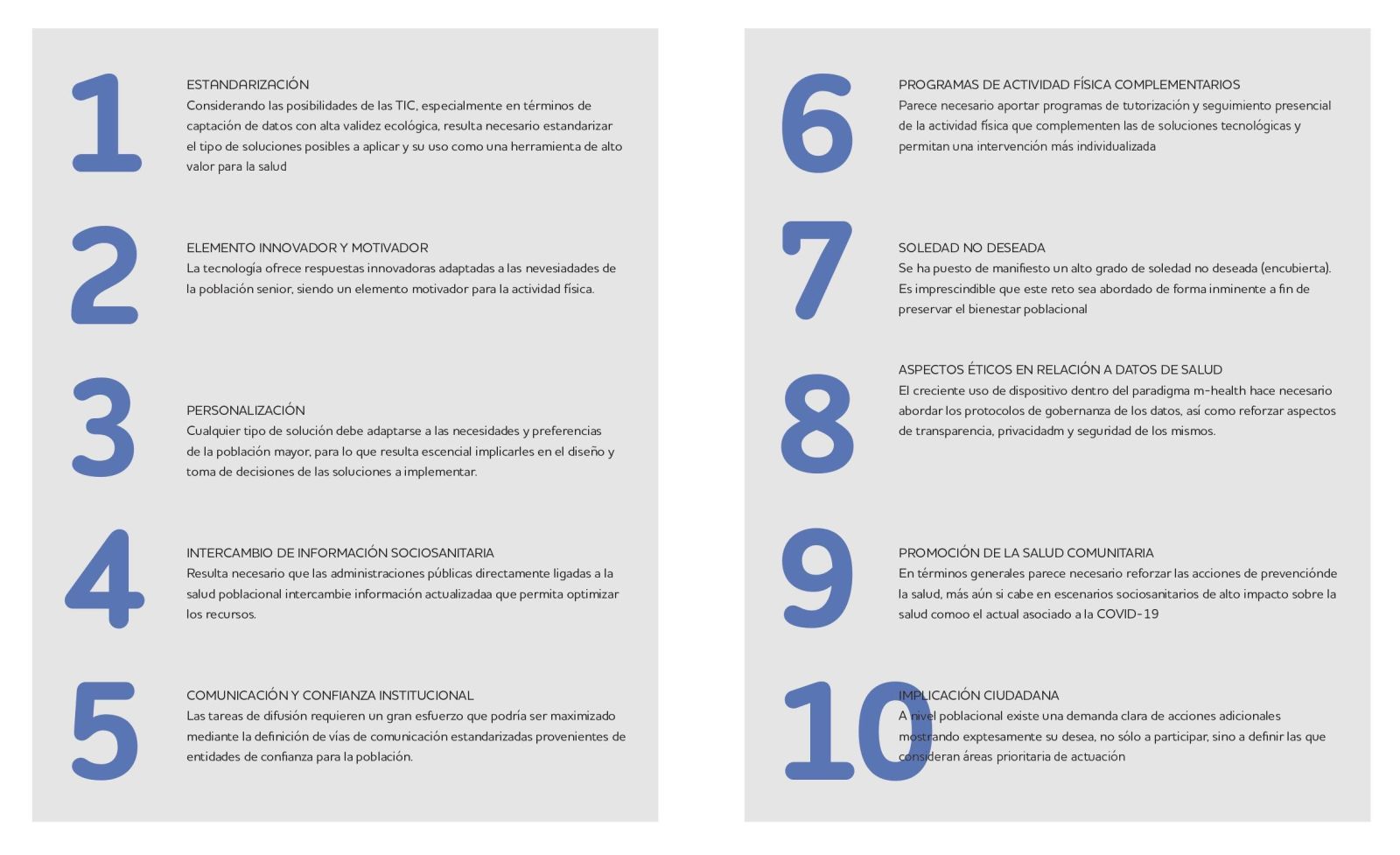Foi desenvolvido um decálogo com as conclusões identificadas para promover um envelhecimento saudável através da motivação para o exercício físico. Ignacio Pedrosa, investigador principal da equipa de investigação da Fundação do Centro de Tecnologias da Informação e Comunicação (CTIC) que conduziu o estudo, declarou que "a tecnologia tem o potencial de ser um elemento motivador que é fácil de integrar nas atividades diárias, complementando as atividades profissionais sociais e de saúde, favorecendo a prevenção e a promoção da saúde a nível da população ao longo do processo de envelhecimento".