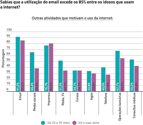 As duas atividades que mais motivam o acesso à Internet, qualquer que seja a idade, é consultar o email e ler a imprensa e as notícias. Exceto neste aspecto de usar a internet para ler a imprensa e notícias, no resto das atividades o seu uso é significativamente mais presente nos menores de 60 anos do que nas pessoas com mais de 60 anos. O uso da internet para atividades de natureza funcional (relacionamento com bancos , consultas médicas) apresenta valores elevados também para pessoas com mais de 60 anos (55% e 42%, respectivamente, daqueles que usam a internet), o que implica uma importante abertura para mudar ou complementar o canal físico com o eletrónico. Se os bancos conseguiram obter 55% dos clientes com mais de 60 anos usando a internet para operar através deste canal, as organizações médicas públicas e privadas, por analogia, têm uma margem para aumentar ainda mais a sua relação através do canal eletrónico a partir dos atuais 42%. Onde se podem ver as maiores diferenças entre os valores alcançados por aqueles com menos de 60 anos em relação aos que têm mais, é participar de redes sociais e seguir cursos de treinamento.