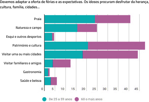 Outra diferença clara é a motivação da viagem. Os idosos procuram principalmente o património e a cultura (27,04%), a visita a cidades (26,07%) e a visita a familiares e amigos (8,37%) e declaram ter menos preferência do que os menores de 60 anos em ir para a praia, aproveitar a natureza e o campo ou praticar esqui ou outros desportos. Portanto, não valem os mesmos produtos que devem ser oferecidos a pessoas mais velhas do que aqueles que têm menos de 60 anos; Eles têm motivações diferentes e, portanto, as suas expectativas sobre o que querem encontrar nos lugares aos que vão e às acomodações que contratar são diferentes. O grau de satisfação com a acomodação (principalmente hotéis) é alto (4,37 de 5), o que se reflete não apenas na satisfação geral, mas também em todos e cada um dos componentes que explicam essa satisfação (tratamento, equipamento , instalações, etc.). Este grau de satisfação é um pouco maior do que o demonstrado pelos menores de 60, portanto, podemos dizer que a oferta atual de férias e lazer para idosos é adequada às suas expectativas.