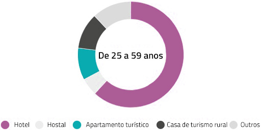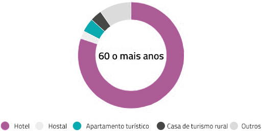 Ao contrário dos menores de 60 anos, as pessoas mais velhas viajam mais em pares (53,87% vs. 35,29%) e sozinhas (9,41% vs. 4,81%) e menos em família (25,80%). em comparação com 45,99%), o que significa que o número de pessoas com quem eles viajam é possivelmente um pouco menor do que no caso de menores de 60 anos e que determina o tipo de acomodação que preferem usar; como já dissemos, hotel em frente a outras opções mais baratas que são mais usadas por menores de 60 anos, como apartamentos turísticos e casas de turismo rural.